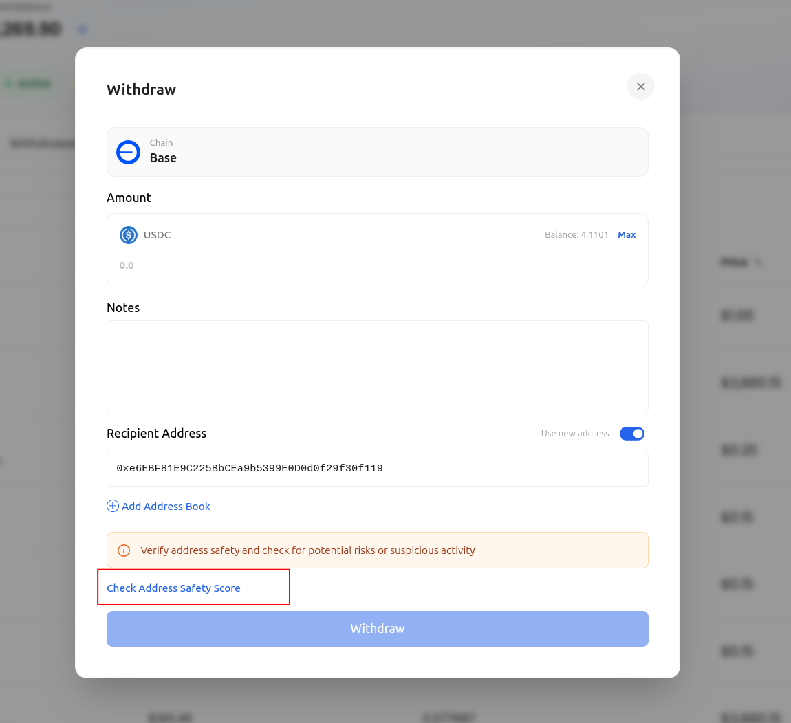Fystack integrates Due Diligence (DD) Risk Check APIs to automatically verify whether a withdrawal address is legitimate and low-risk. This safeguards customers from transacting with sanctioned, high-risk, or blacklisted addresses that could later be flagged by centralized exchanges.