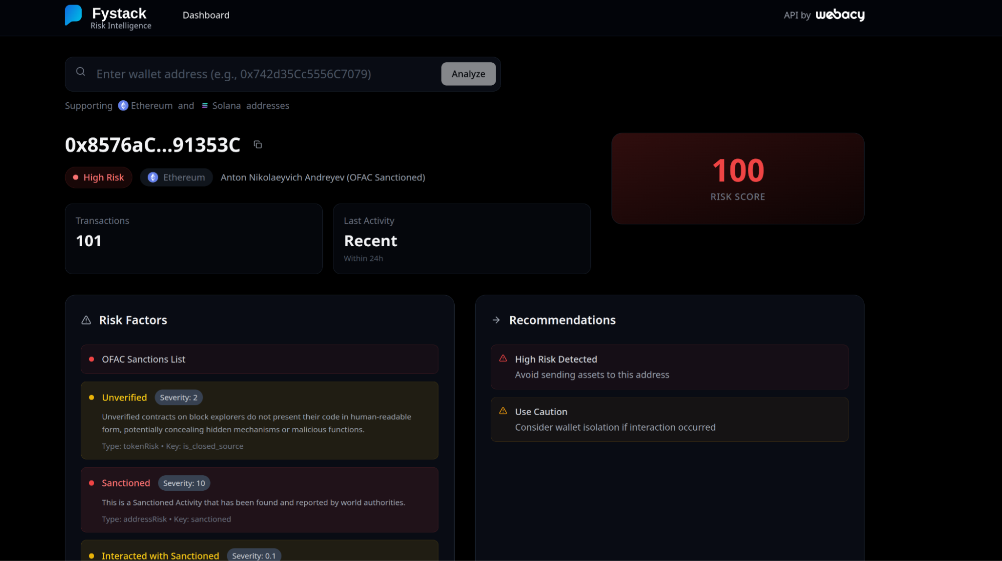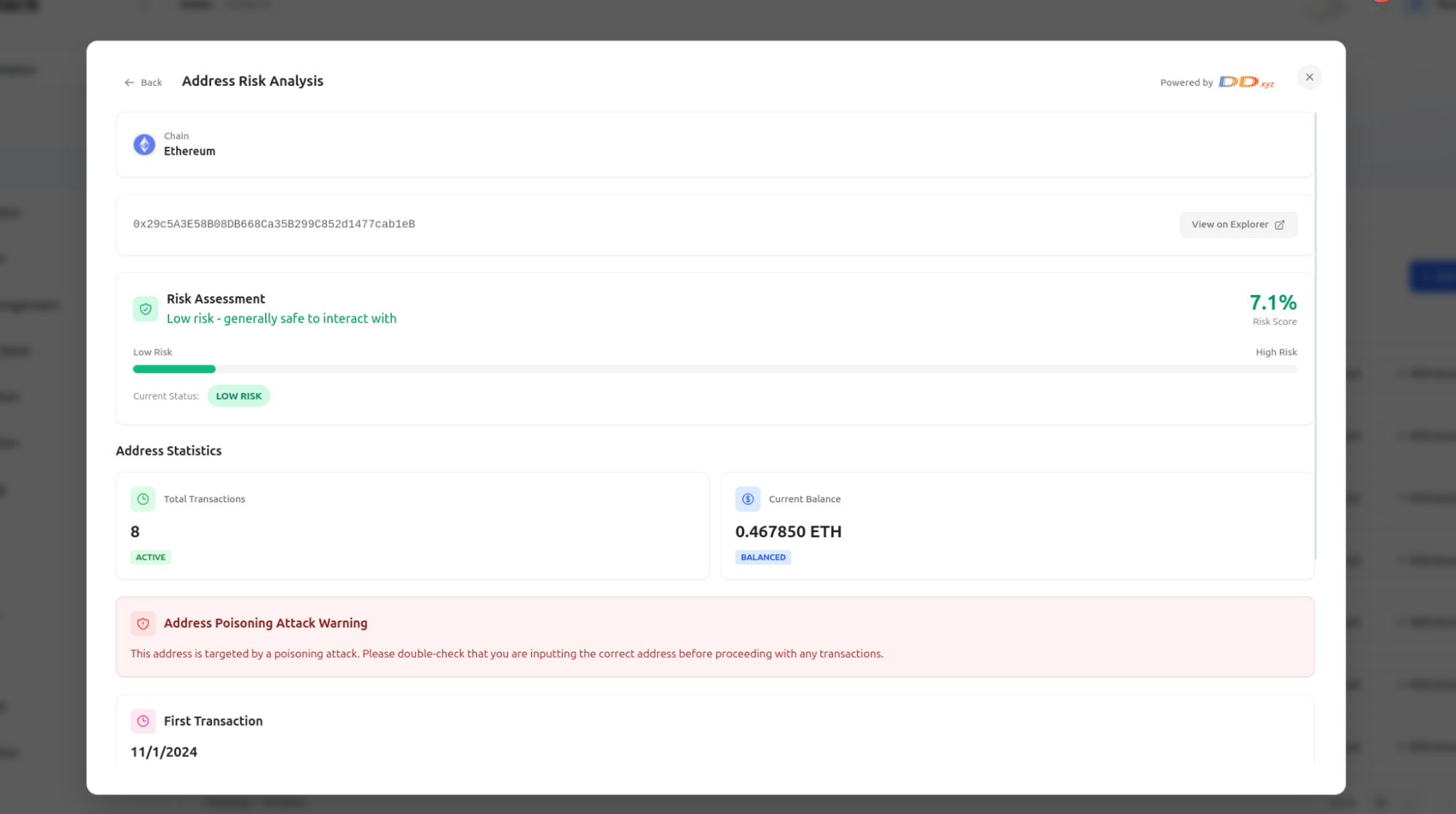 In addition, Fystack implements an Address Poisoning Detection feature that identifies spoofed or look-alike malicious addresses — a common Web3 attack vector that tricks users into sending funds to fraudulent destinations.