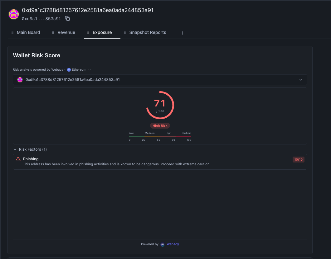 - Counterparty Due Diligence: Look up any address before you interact. Whether it’s a trader, a liquidity pool, or a new contract, you can paste the address for an instant risk breakdown to transact with confidence.