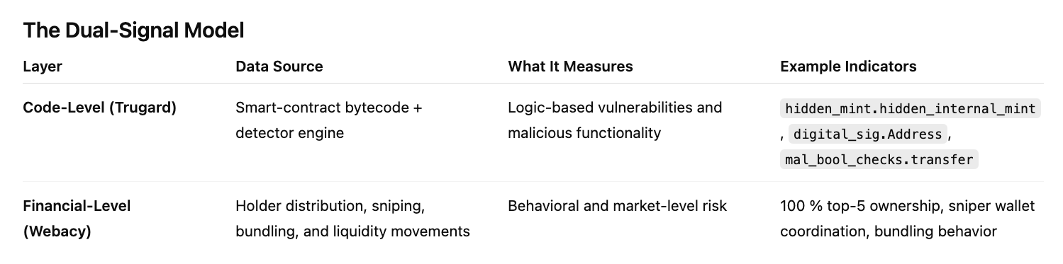 Vulnerability analysis must extend beyond code itself. By merging source-level detections with holder and behavioral telemetry, Webacy’s multi-layered model gives greater visibility into a contract’s true risk profile. Contracts showing high detector density and financial anomalies (100 % top-5 ownership, sniper control) account for nearly all confirmed rugs.