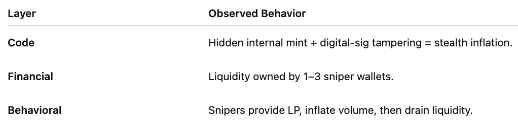 - Stealth Inflation Farms: internal mint + sniper-controlled liquidity.
