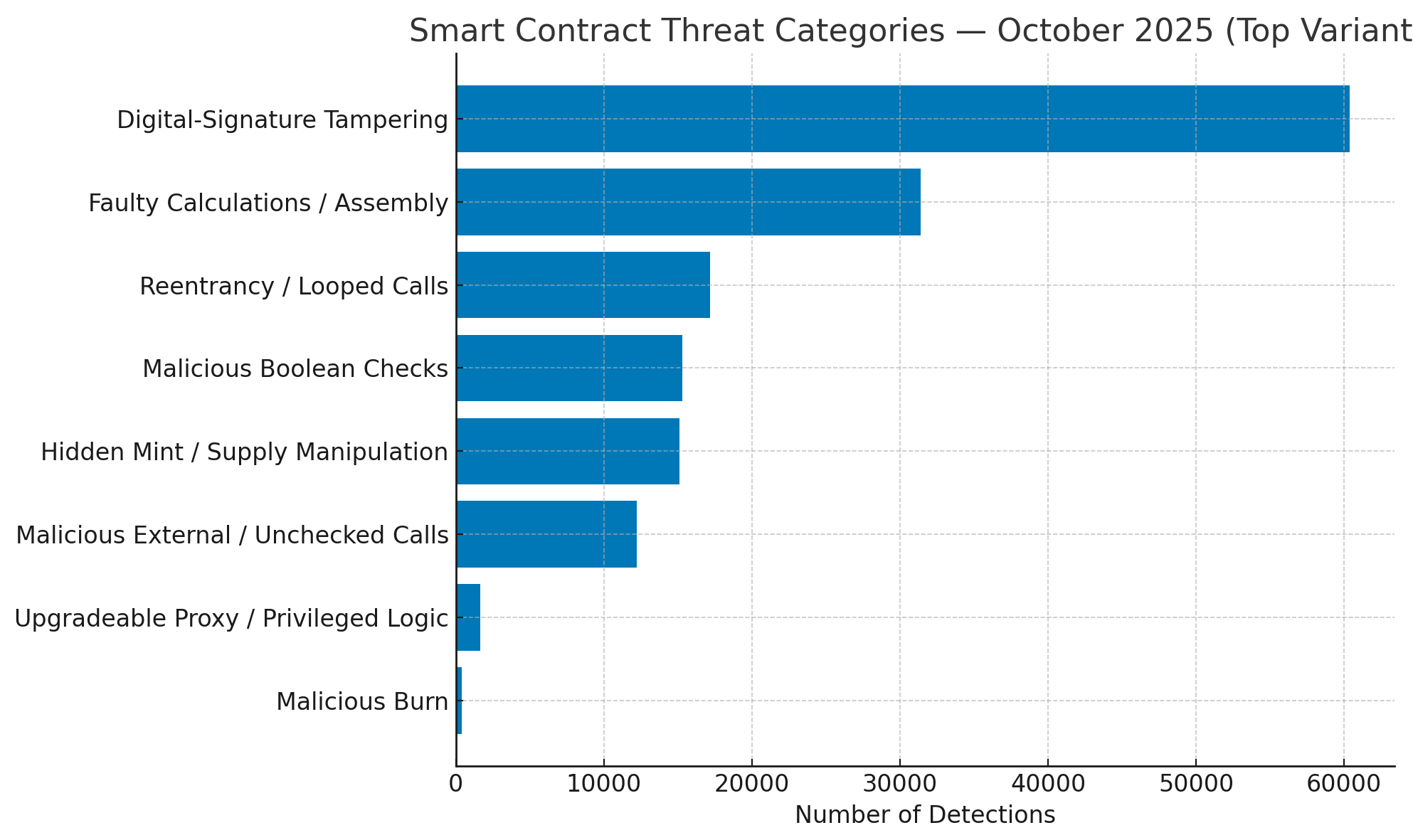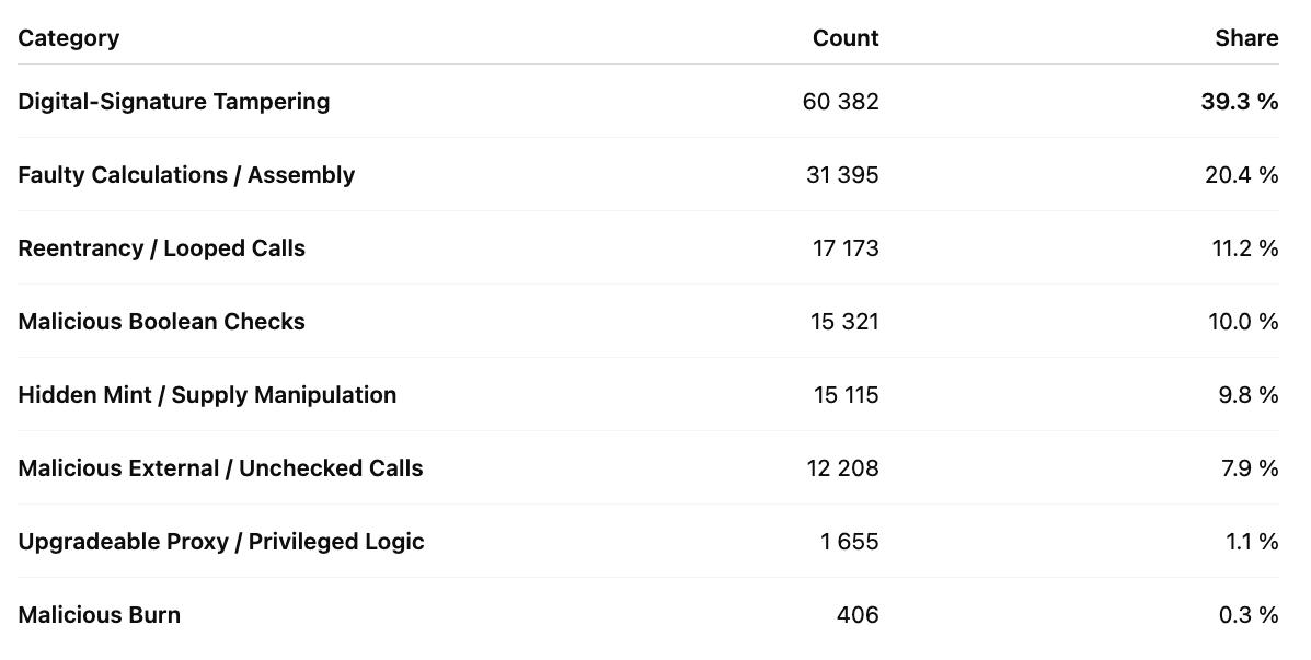 - Digital-Signature Tampering: Found in roughly 40% of flagged contracts, often due to unsafe or outdated math and cryptography libraries.