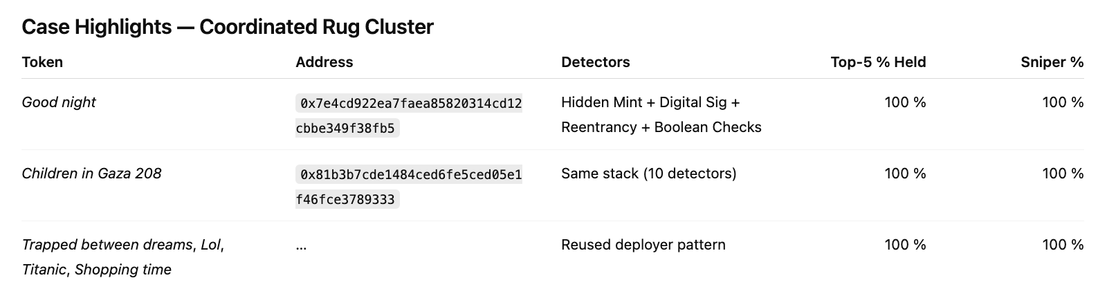 - Contracts triggering ≥8 detector families were 9× more likely to rug.