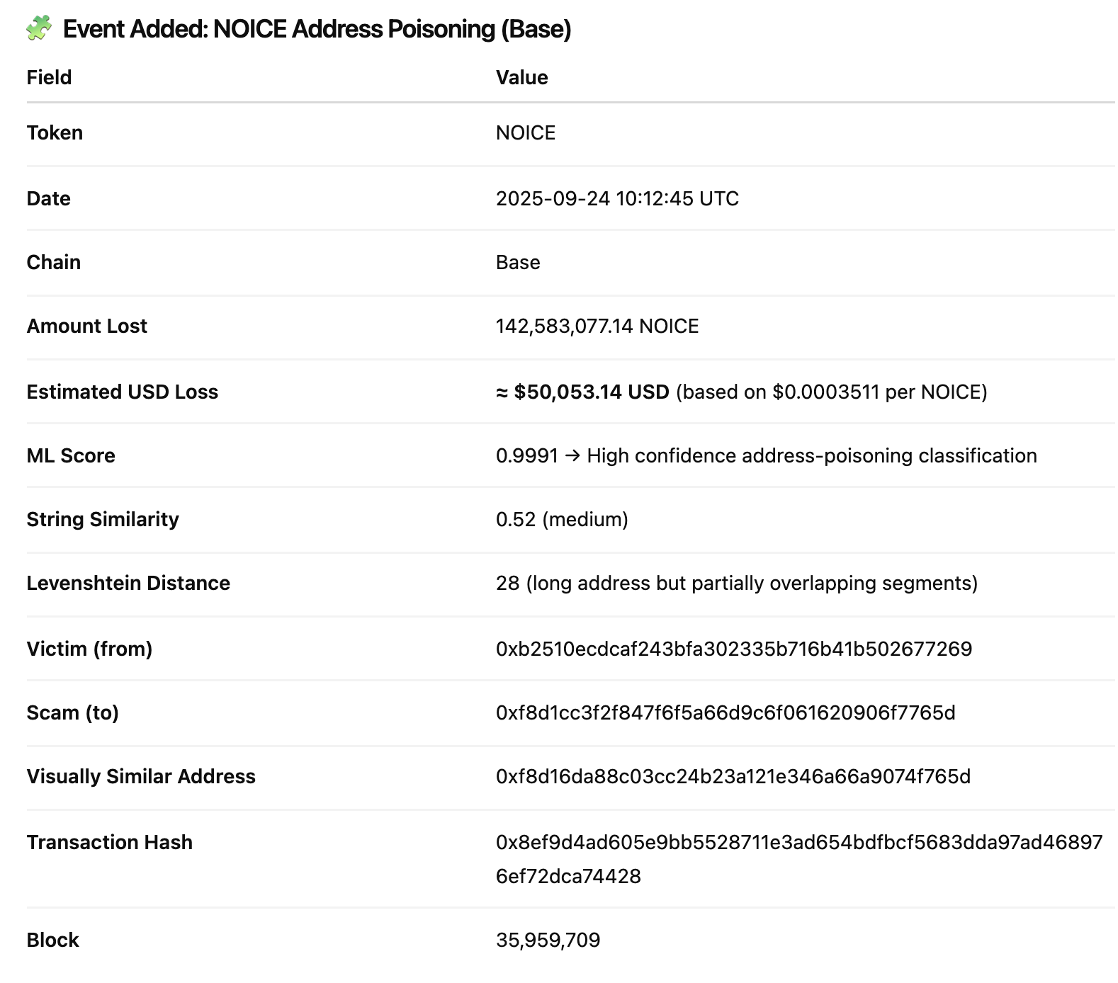 Single large drain vs repeated small drains: Unlike the previous incidents posts involving multi-transaction poisonings this incident is a single very large-loss event. The high ML score plus the near-identical spoofed address indicate the attacker prepared a visually-similar address aimed at fooling copy/paste or click-to-paste victims. The magnitude of the NOICE transfer suggests the victim copied a spoofed address (or selected it from a poisoned dropdown / UI), then executed a transfer, a classic address-poisoning outcome where large single transfers replace the multiple small-value patterns seen elsewhere.