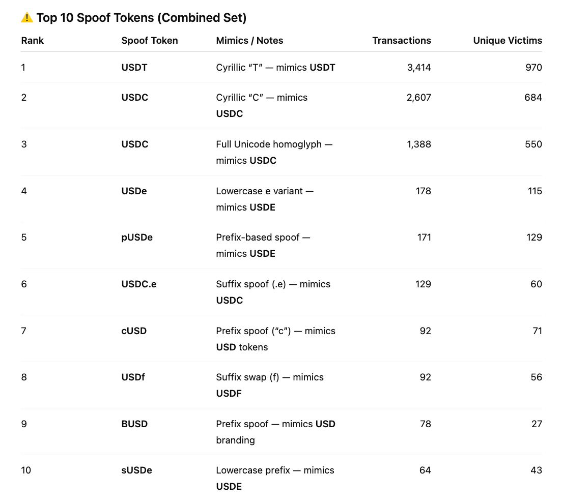 Here are some of examples Top 10 spoofed stablecoins variants: