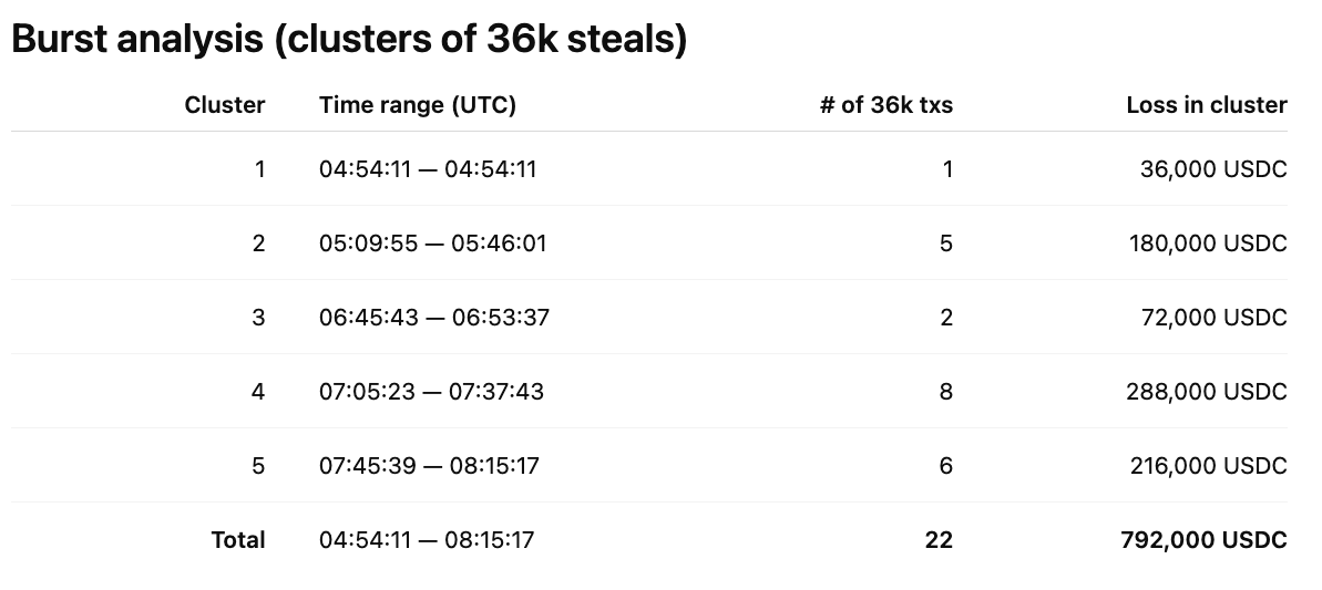 Total quantified loss (36k events): 22 × 36,000 = 792,000 USDC.