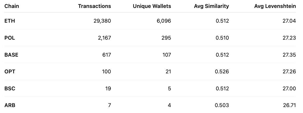 Ethereum remains the primary vector for poisoning attempts accounting for >90% of all flagged activity. What is also interesting is that Layer 2 networks (Polygon, Base, Optimism) are starting to show measurable activity, indicating scammers are adapting as more users move to L2 ecosystems.