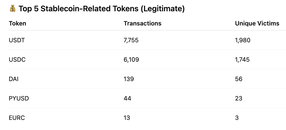 Attackers overwhelmingly target stablecoins, USDT and USDC dominate exposure (see table and analysis below).